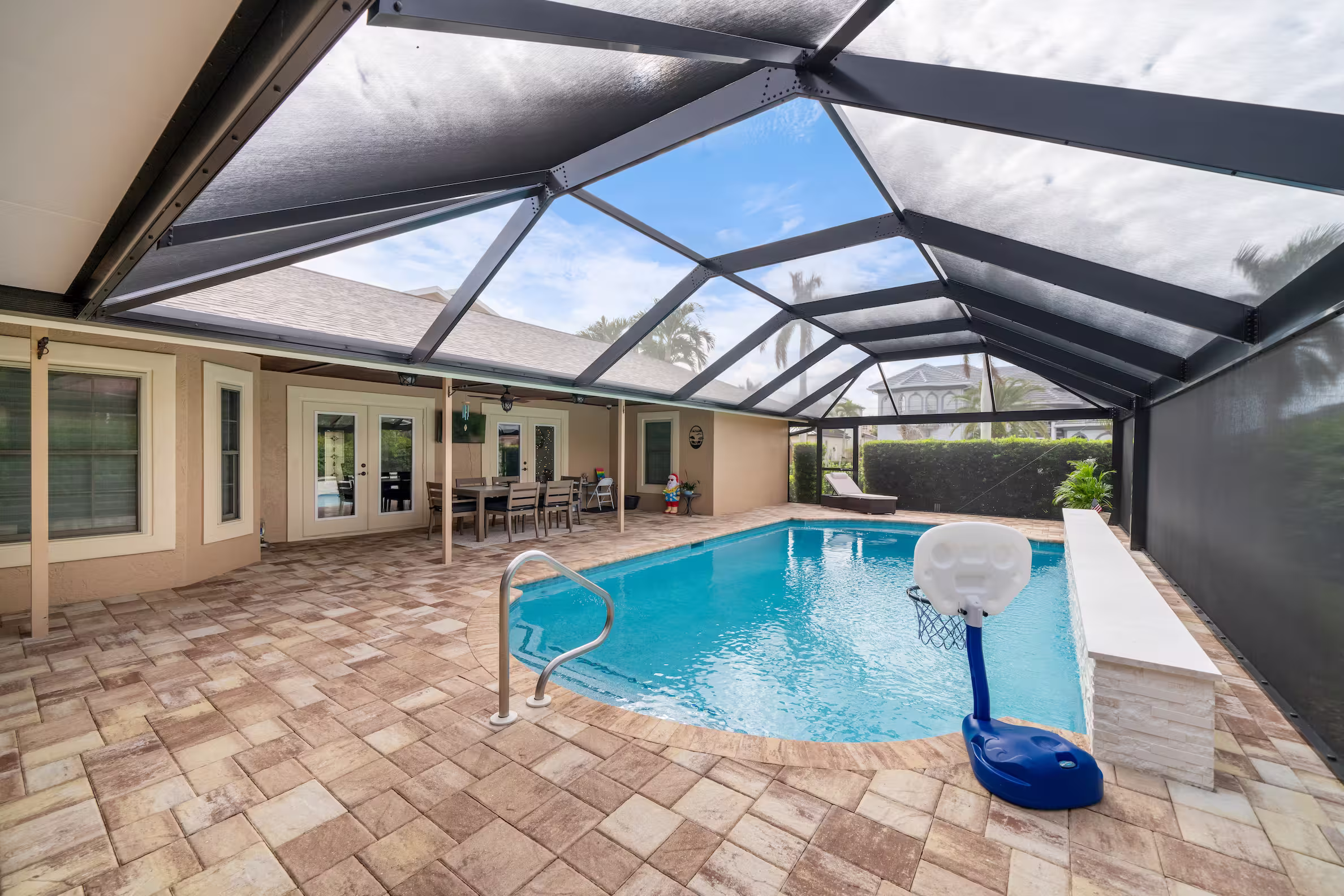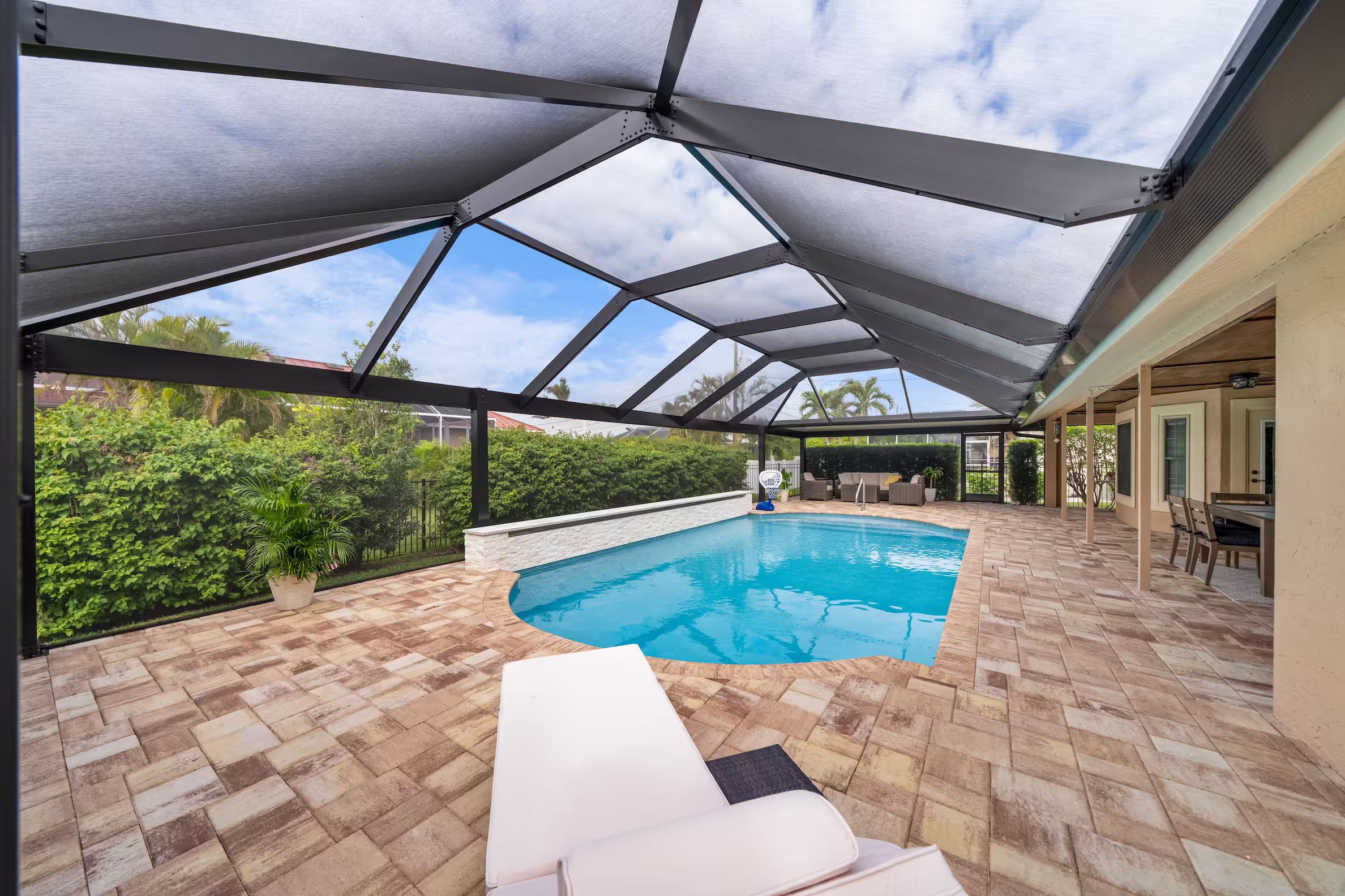 This backyard underwent a complete transformation—from a stripped-down concrete shell to a sleek and inviting private oasis. We fully renovated the pool interior with new plaster and waterline tile, replaced the old decking with stylish pavers, and added a white stacked-stone wall for a clean, contemporary touch. The space was enclosed with a custom screen structure, blending comfort, function, and style. What was once a dated patio is now a vibrant, entertainment-ready retreat.