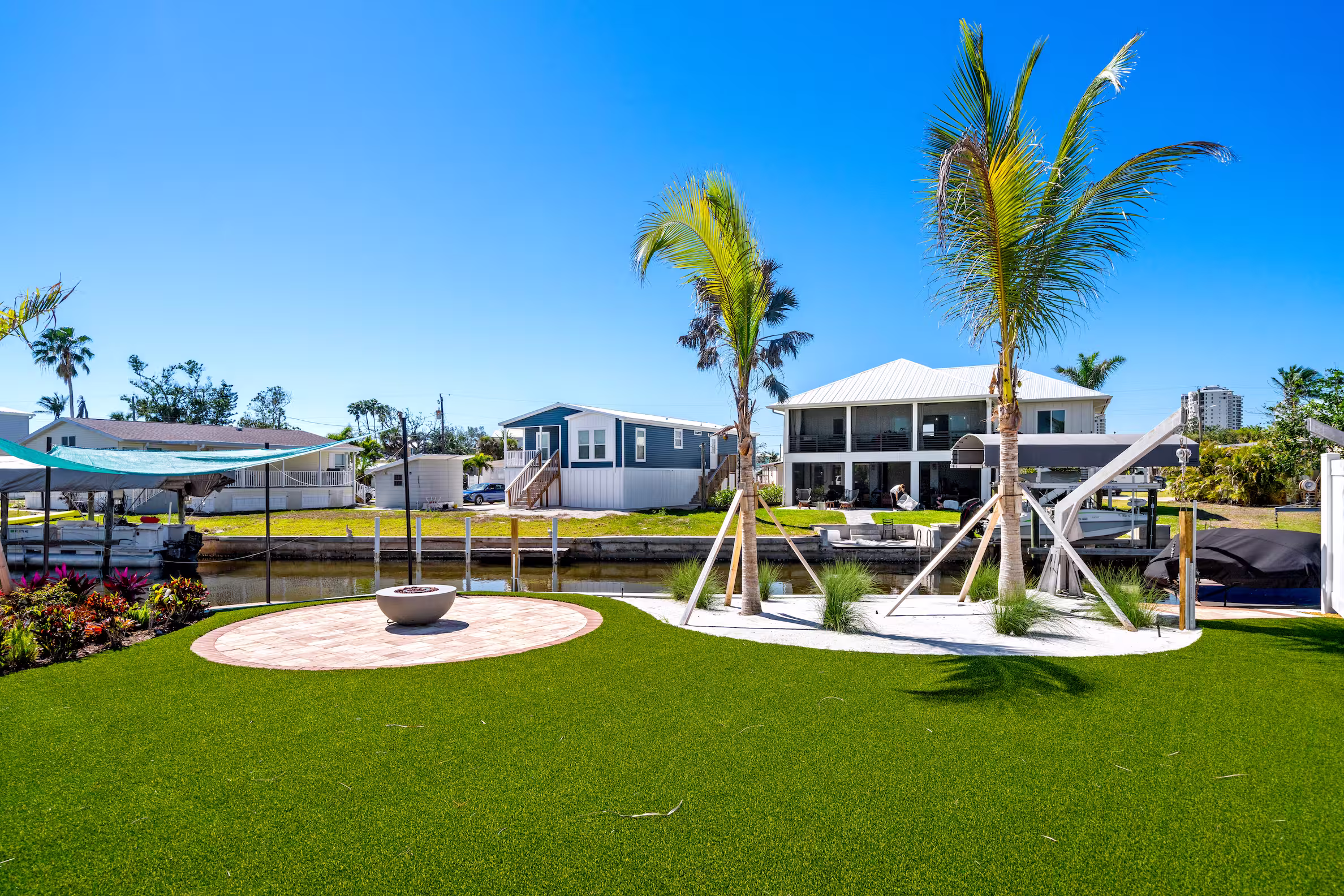What began as a blank waterfront lot was completely reimagined into a vibrant tropical retreat. We built a full paver deck along the seawall, added synthetic turf for a lush, low-maintenance green zone, and created multiple outdoor living spaces with modern shade sails and custom landscaping. Palms, pops of color, and layered textures bring the entire space to life, transforming it into the ultimate canal-front getaway.